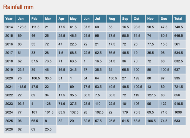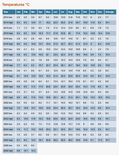 The two tables below include rainfall and temperature data for all months from 2014 onwards. For daily summaries, please see in-depth data in the following links.