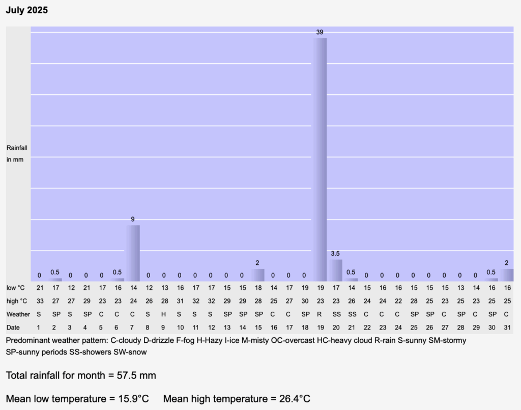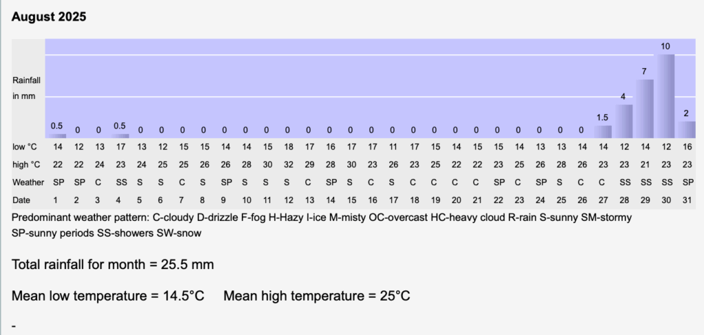 A very dry August with a welcome refreshment for the gardens at the end of the month.