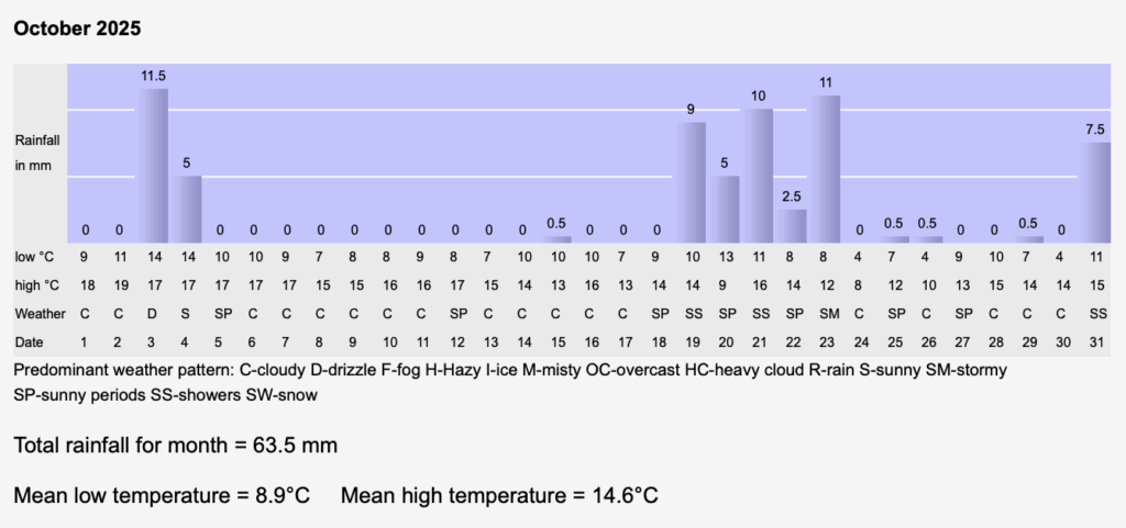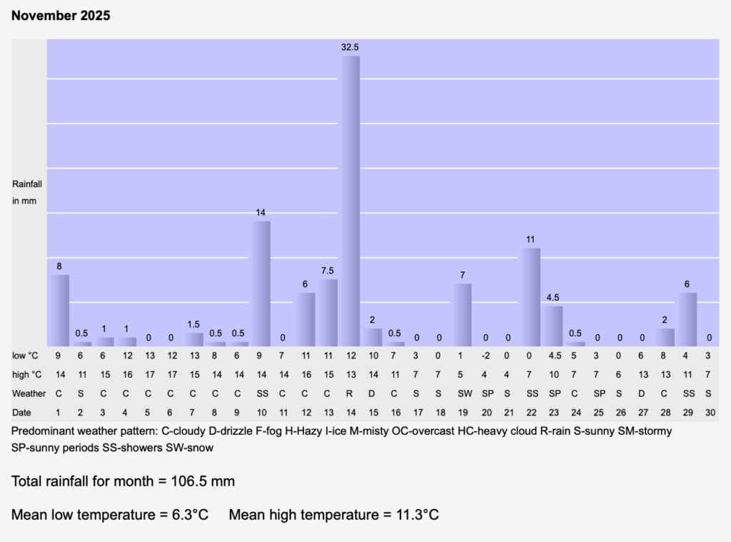 November rainfall was high, in fact the second highest that we’ve had over the last 12 years. Temperatures about average.